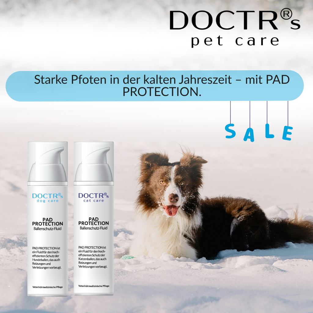 PAD PROTECTION schützt die Ballen des Vierbeiners zuverlässig vor Kälte, Streusalz und rauen Untergründen. Das pH-adaptive und hypoallergene Fluid stärkt die natürliche Barriere, pflegt intensiv und ist selbst beim Ablecken absolut ungefährlich – es ist lebensmittelecht und ideal für den Winter.