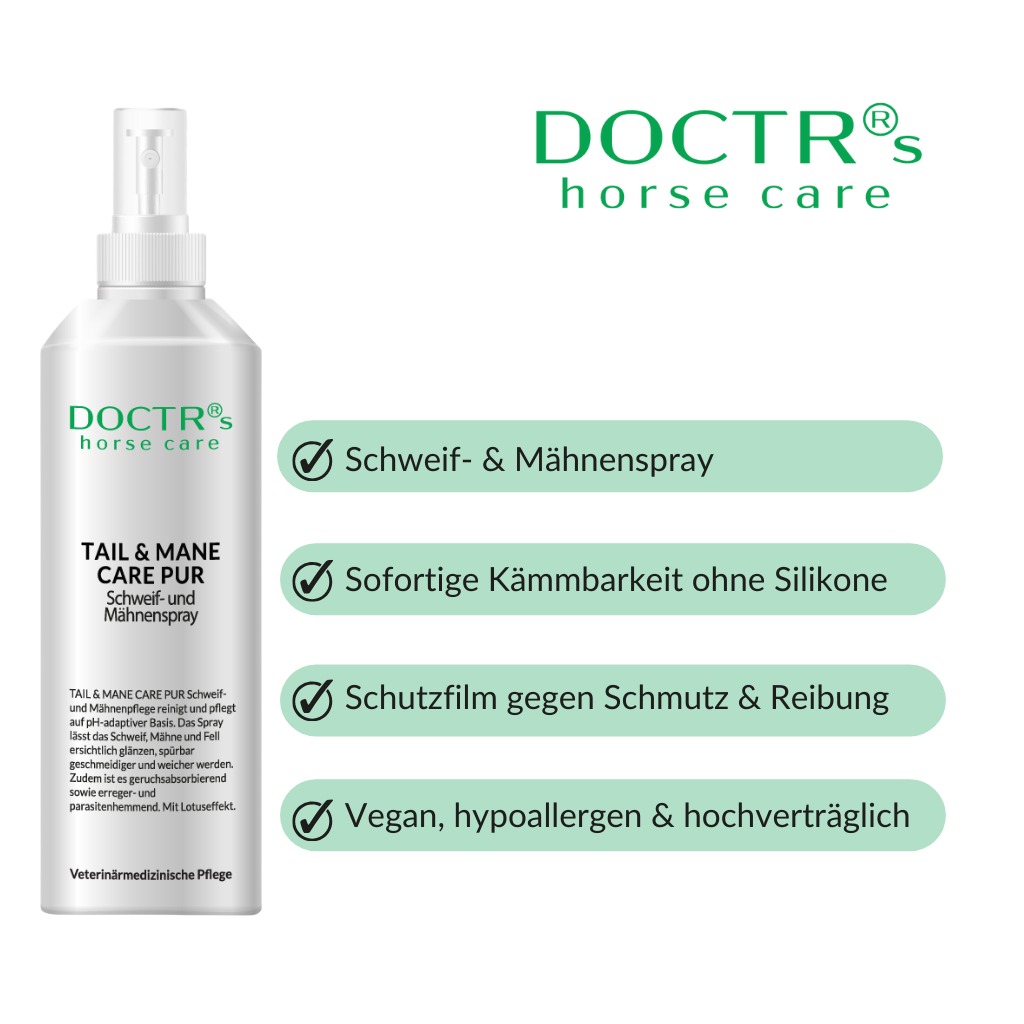 TAIL & MANE CARE PUR wurde, wie alle Produkte von DOCTR®s horse care,in Allianz mit der Tierklinik Duisburg geprüft, welche auch die hypoallergene Verträglichkeit bestätigt hat.